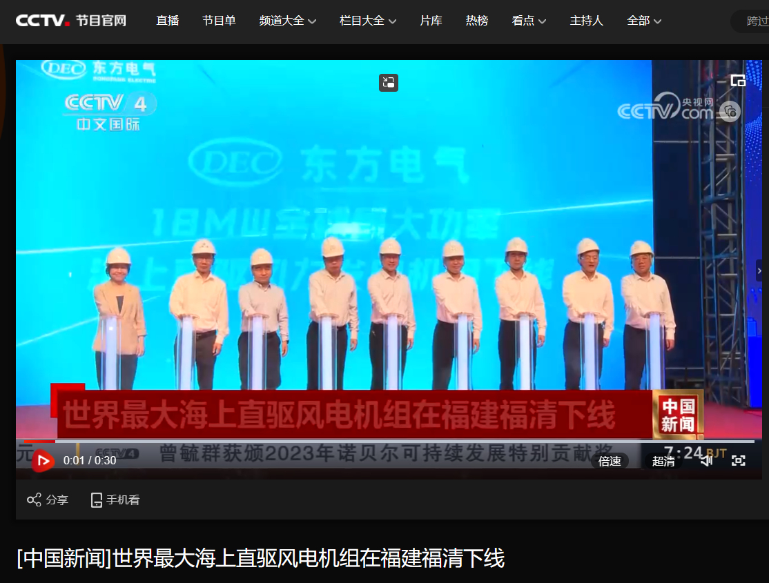 [央视中国新闻]天下最大海上直驱风电机组在福建福清下线