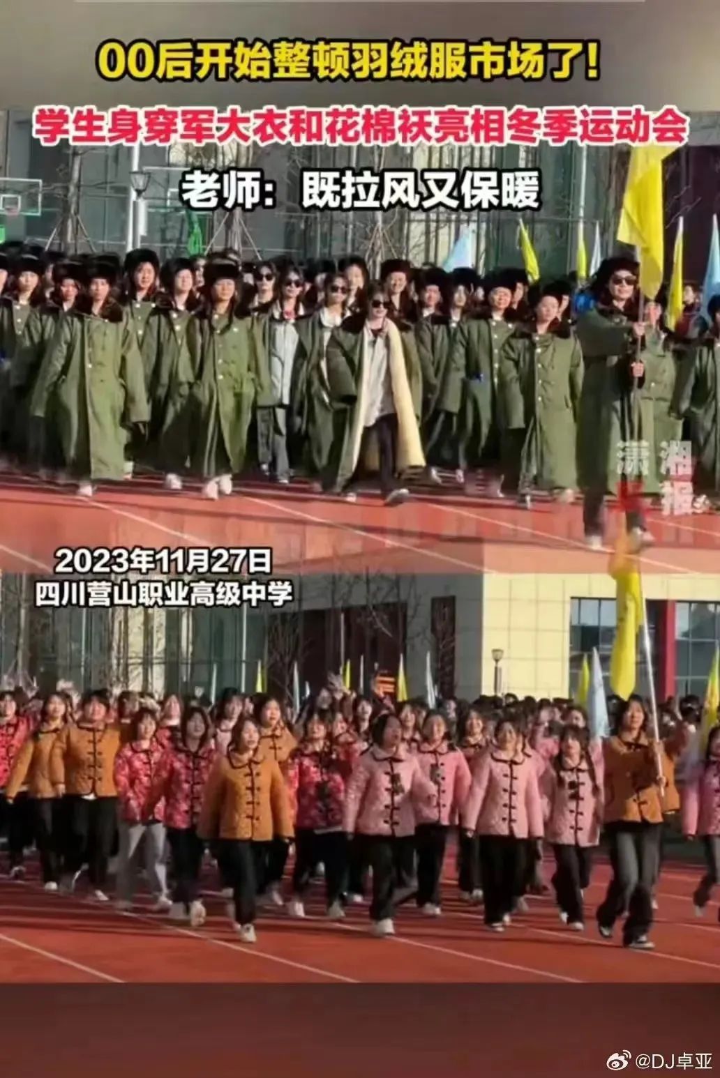 一排排大学生裹着军大衣、衣着花棉袄